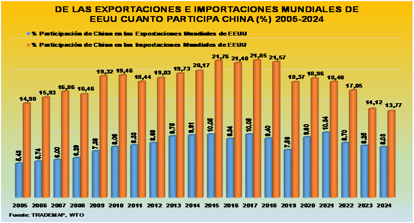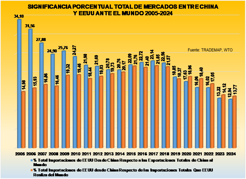 En cuanto a totales, las importaciones norteamericanas respecto a lo que China exportó al mundo representaron para China el 34,10% en 2005, hasta descender en 2024 al 13,77% de sus exportaciones mundiales, con lo cual se produjo una importante reducción de dependencia del mercado norteamericano como destino de sus exportaciones. Por otra parte, para Estados Unidos la importancia de China como proveedor mundial (importaciones de EEUU desde China respecto de lo que EEUU importó del resto del mundo) no tuvo una significativa reducción, pues en 2005 le proveyó del 14,98% de sus importaciones mundiales y en 2024 cayó al 12,94%.