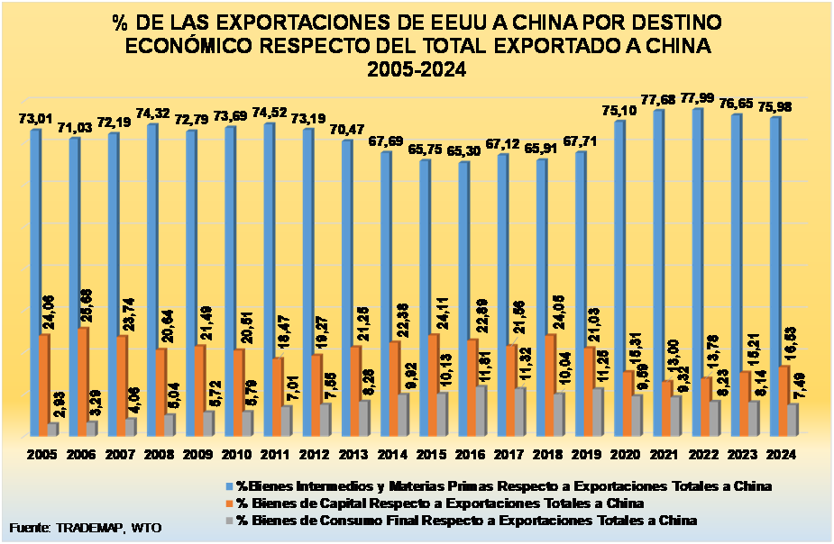 De las exportaciones norteamericanas a China, destinadas para bienes de consumo intermedio y materias primas de la industria local china, estas representan en promedio el 8,16% de lo que EEUU exporta al mundo en ese rubro. De hecho, para 2005, significó el 5,54% de las exportaciones mundiales de EEUU y luego de veinte años de oscilaciones que nunca alcanzaron el 10%, en 2024 representaron el 6,57%, lo cual lo ubica ese rubro en el relacionamiento bilateral, dentro de lo más difícil de expandir dentro del mercado chino y lo que nos está indicando, es que esas exportaciones de esos rubros, son colocaciones de insumos de las casas matrices de la industria norteamericana en China, para lo cual, expandirse más allá de lo que han logrado, sólo es posible por intermedio del aumento en consumo de lo que sea que se produce con esos insumos dentro de EEUU.