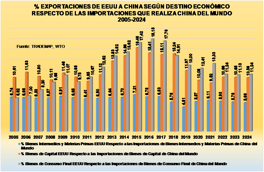 Por su parte, el mercado chino como destino de las exportaciones norteamericanas, durante el período de tiempo entre 2005 y 2024, representa en promedio el 8,35% para las exportaciones mundiales norteamericanas. El suministro de EEUU a China respecto de lo que China trajo del mundo, fue de 5,43% en 2005, y desde ese año ganó terreno incrementándose hasta alcanzar el 8,03% del mercado mundial chino en 2024, con años posteriores a 2005 y previos a 2024, donde alcanzó hasta más del 10% del mercado mundial chino.