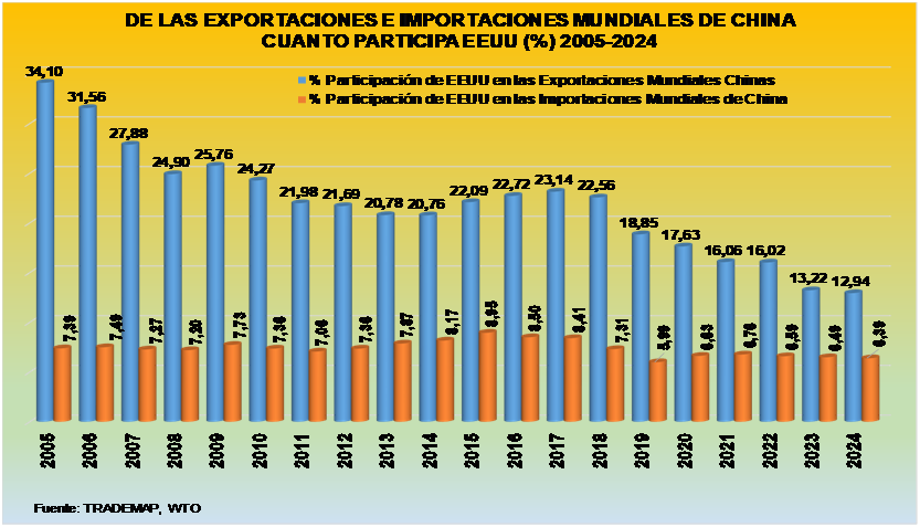 Además no se ve tampoco reflejado cómo si se ven las disminuciones de la dependencia de China del mercado norteamericano, tal como ha ido disminuyendo, ya que en 2005 el mercado norteamericano representaba el 34,10% del mercado mundial y en 2024, el mercado norteamericano disminuyó hasta el 12,94% de las exportaciones que China llevó a cabo al mundo, bajó bastante su dependencia de ese mercado como espacio de exportaciones para China en el mundo. Mientras que China para EEUU, permaneció poco alterado.