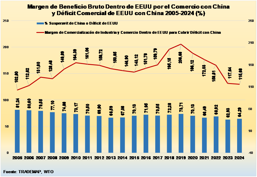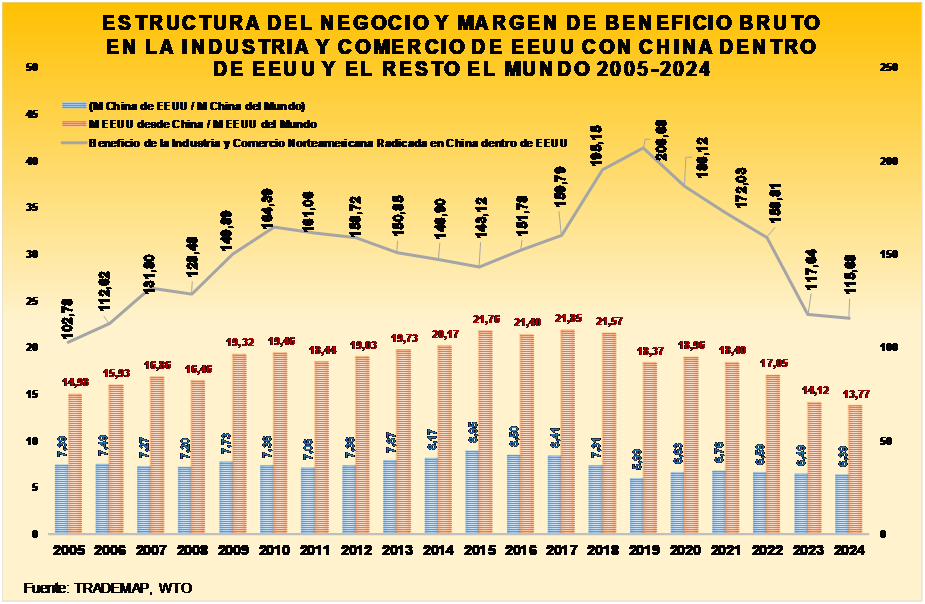 Siguiendo en la misma línea de análisis, de que, EEUU respecto a la porción que exporta al mundo, exporta casi sin variación hacia China y realiza importaciones con la misma precisión, pudimos conducirnos dentro de esa percepción de la manera siguiente: restamos el % de participación de EEUU en las importaciones mundiales de China (el % mundial de las importaciones chinas provenientes de EEUU) del % de participación de China en las importaciones mundiales realizadas por EEUU (el % de las exportaciones mundiales de China hacia EEUU), el resultado lo dividimos entre el % de participación de EEUU en las importaciones mundiales de China (el % mundial de las importaciones chinas provenientes de EEUU) y lo multiplicamos por 100, para obtener el beneficio bruto de la industria y comercio dentro de los Estados Unidos y el mundo (si es que exportan sin cumplir reglas de origen o no se les exige).