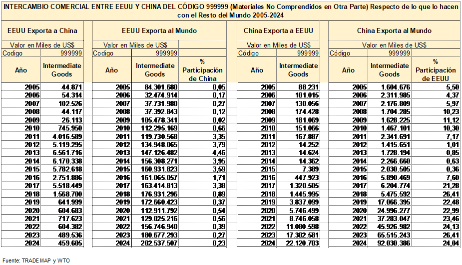 Entre 2017 y 2024, el movimiento de exportaciones bajo el código 999999 de China hacia EUU, le reportó el equivalente promedio inter anual del 23,90% de bienes de consumo intermedio, lo cual puede ser muy probable, dada la significancia de las cifras, ya que en 2024 sobre pasó los 92 mil millones de dólares de lo exportado hacia EEUU.