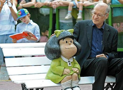 Joaquín Lavado, más conocido como Quino, junto a una escutura de Mafalda en Buenos Aires.