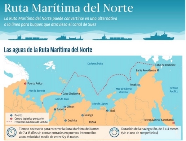 La Ruta Marítima del Norte es una arteria de transporte utilizada en forma activa por la Federación de Rusia, no sólo para atender las necesidades de sus territorios del norte y Extremo Oriente, sino también para el activo comercio con China que es tremendamente favorable pues, la ruta de San Petersburgo a Shanghái dura 28 días, mientras que utilizar el canal de Suez implica 50 días.