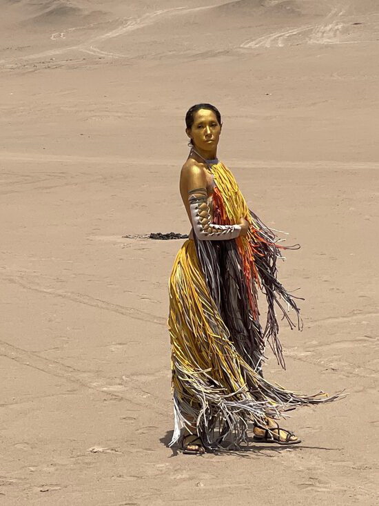 Uno de los momentos más significativos de la intervención fue la participación de la diseñadora Fabiola Aillón, quien, con las mismas prendas del gigante, creó un vestido cargado de movimiento y simbolismo. La pieza fue presentada en una performance donde la modelo, pintada de amarillo solar, encarnaba la unión entre el gigante y el ser humano, proponiendo una reflexión sobre la conciencia y el diálogo necesario entre consumo, territorio y cuerpo. Desde esa intervención nació la idea de llevar el vestido a los Premios Caleuche: exactamente la misma prenda fue la que Seguel vistió en la ceremonia.