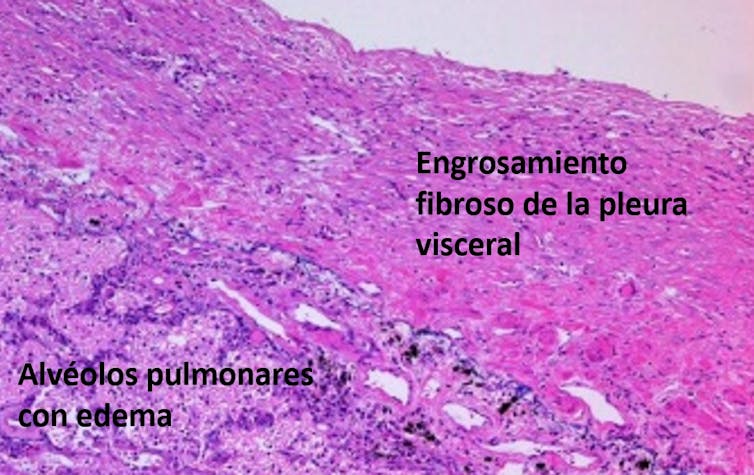 La asbestosis stricto sensu es una auténtica neumoconiosis, es decir, la proliferación incontrolada de tejido conectivo fibroso en el pulmón. O, lo que es lo mismo, una fibrosis difusa cicatricial del tejido pulmonar provocada por la inhalación de amianto. El tejido pulmonar deformado y rígido hace que sea más difícil que los pulmones funcionen correctamente. A medida que la fibrosis pulmonar avanza, el paciente presenta cada vez más dificultades respiratorias.