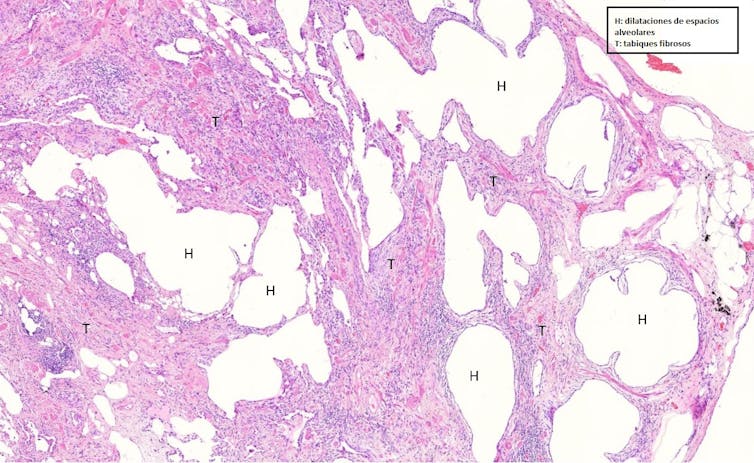 La asbestosis se inicia con una fibrosis en torno a los bronquiolos respiratorios y los conductos alveolares, desde donde se extiende hasta afectar el resto del tejido adyacente. El tejido fibroso deforma la arquitectura del órgano y crea lo que se conoce como un patrón morfológico en “panal de abeja”, también denominado panalización. Este patrón es inespecífico, por lo que la historia de exposición al amianto es la clave para el diagnóstico certero de la asbestosis.