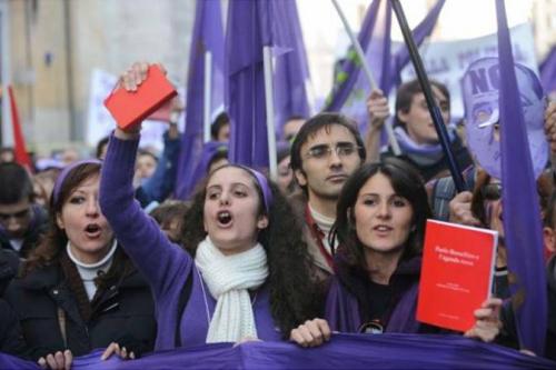 En la caseta de Liberazione, Flavio Nobile, secretario de la sección romana del Partido de los Comunistas Italianos, se alegra por el gran éxito de la manifestación y la ve como punto de partida para formar una nueva oposición en el país. Sin embargo, dice Nobile, la manifestación revela la dificultad de construir esa oposición en las fábricas, en los barrios, en las ciudades. «La red ha conseguido reflejar de modo espontáneo un malestar muy extendido y fuerte. El problema es que políticamente no se ve la capacidad de encontrar una síntesis que dé salida a ese malestar. Con todo, la red sola difícilmente podrá servir para construir un proyecto político, que es lo que necesita este país».