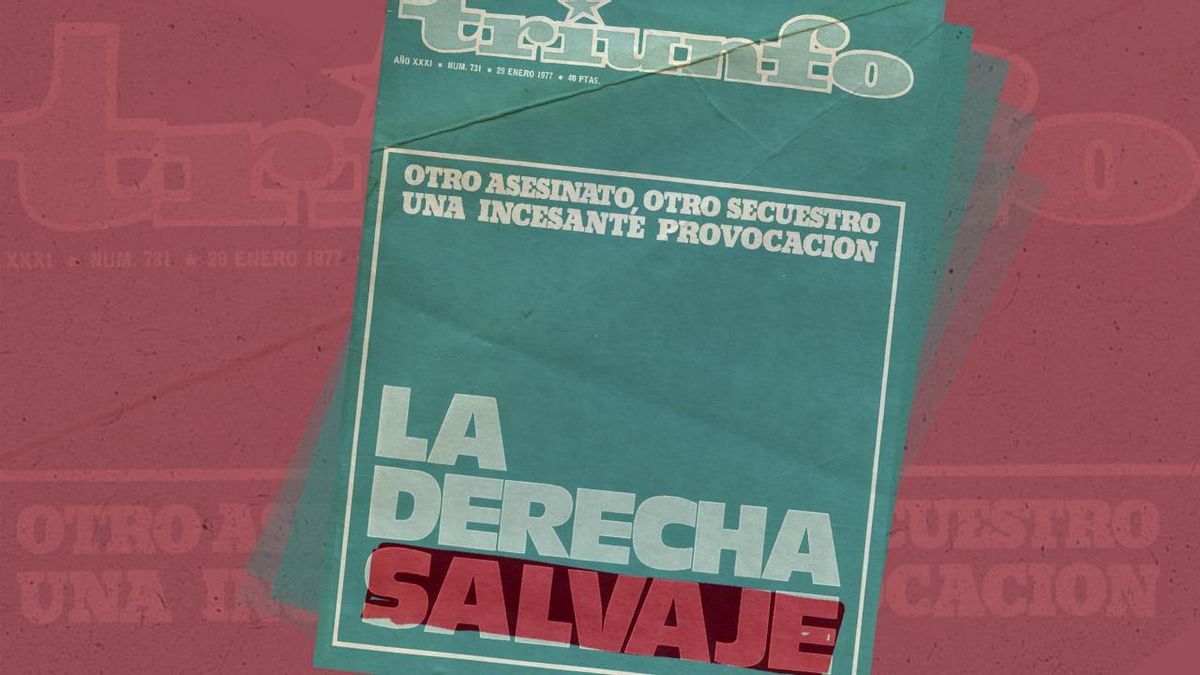Triunfo nació como una revista de espectáculos, pero pronto empezaron a escribir en ella los intelectuales demócratas más influyentes. Sufrió los embates de la censura, apostó por la libertad y de alguna manera fue víctima de ella: dejó de publicarse en 1982. Esta portada refleja el horror ante los asesinatos fascistas de la semana trágica de enero de 1977. La colección de Triunfo se puede consultar en https://www.triunfodigital.com
