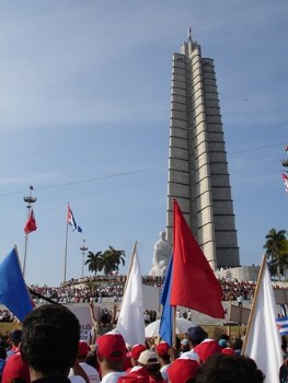 El desfile militar comenzó a las ocho en punto pero nosotros no comenzamos a caminar hasta las 9:15, aguardábamos en un río compacto, imaginé que esperábamos a que terminaran de desfilar las fuerzas armadas. A lo largo de toda la espina de Paseo se habían colocado altavoces que retransmitían lo que ocurría en la Plaza de la Revolución. Cuando sonó el himno nacional se hizo un silencio impresionante y jóvenes, niños, adultos, ancianos todos comenzaron a cantar a mi alrededor con una sola voz. Se inició la espera de una hora hasta poder movernos. Durante ese tiempo, a nuestro alrededor, un tipo vestido de militar bromeaba con una joven, una anciana sacaba de la jaba unos bocaditos que daba al nieto, una mujer en un grupo con camisetas rojas preguntaba por una compañera del trabajo y le gritaban a otra que alzara el cartel para que se les viera «Tribunal supremo popular» rezaba el cartel. Mi joven acompañante se quejó del calor que ya empezaba a hacer, sacó unas galletas y la botella de agua: «¡esto está fatal organizado, como no empiece pronto…!». Yo pregunté ¿Cuánta gente crees que seremos? – «no sé, ¿quinientos mil?»-, «¡ah!», dije tomando una de sus galletas.